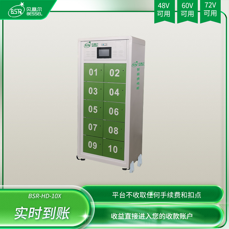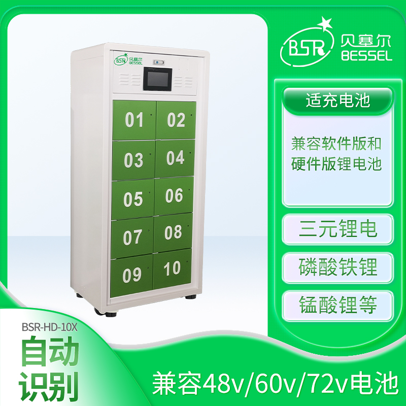電動車共享換電柜10倉,同一臺柜子兼容48V/60V/72V電池充換電,柜子適充三元鋰電/磷酸鐵鋰等電池。