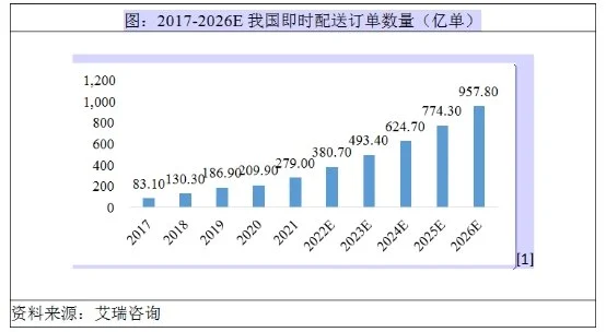 根據(jù)艾瑞咨詢《中國(guó)即時(shí)配送行業(yè)趨勢(shì)研究報(bào)告(2022年)》,2026年我國(guó)即時(shí)配送服務(wù)行業(yè)訂單規(guī)模將接近千億量級(jí),達(dá)957.8億單,2021年-2026年復(fù)合增長(zhǎng)率為28.0%,行業(yè)整體仍處于快速發(fā)展路線上。